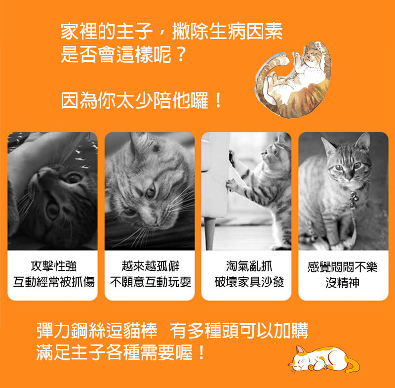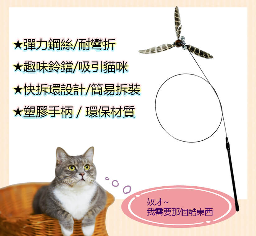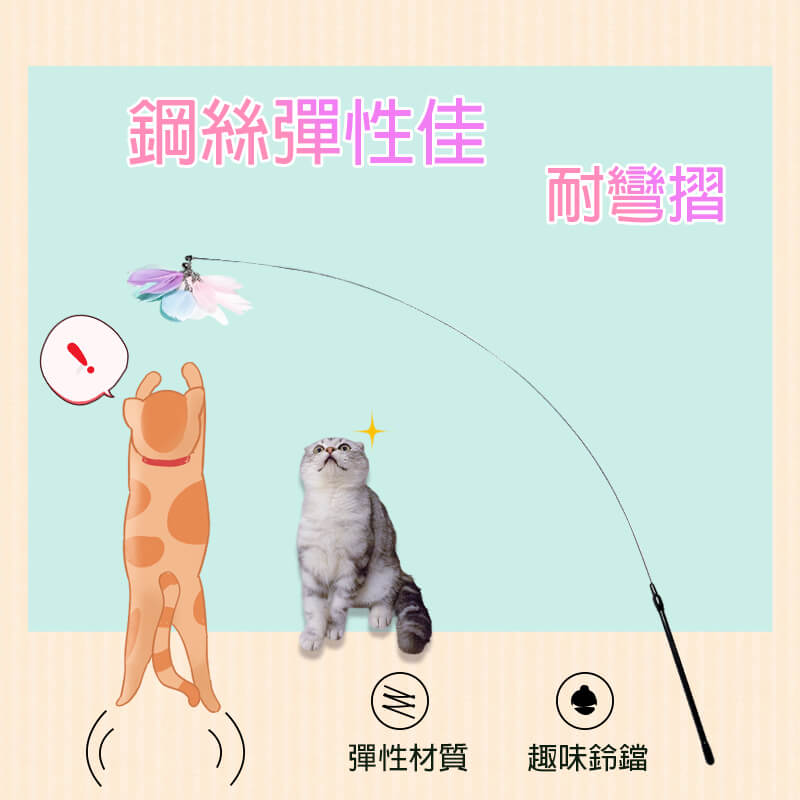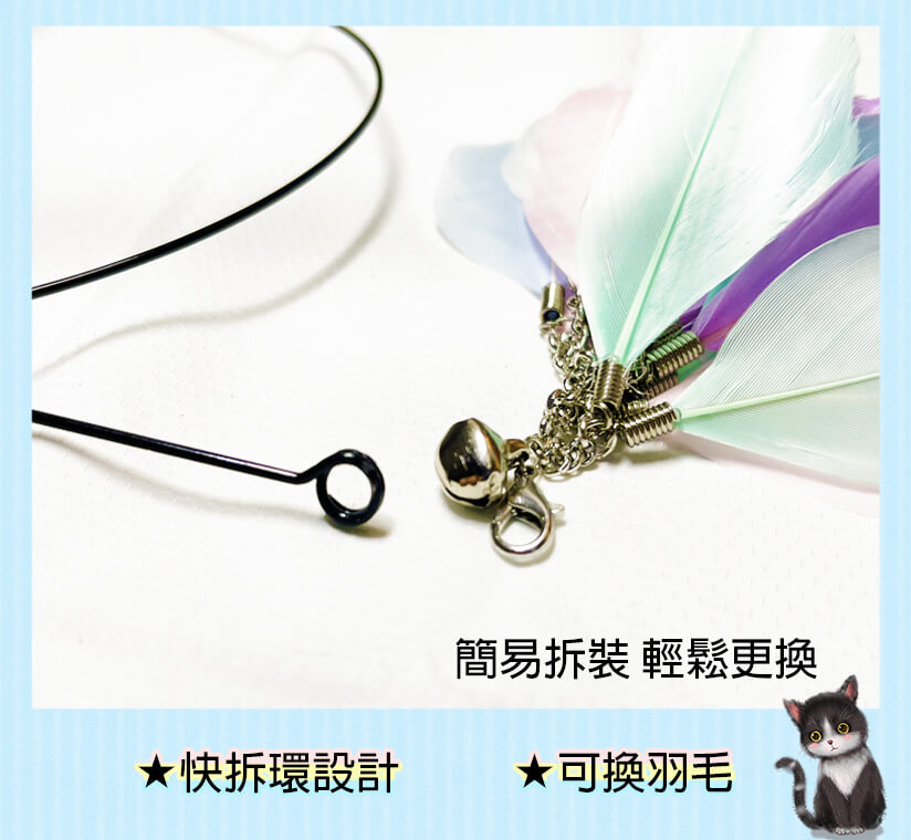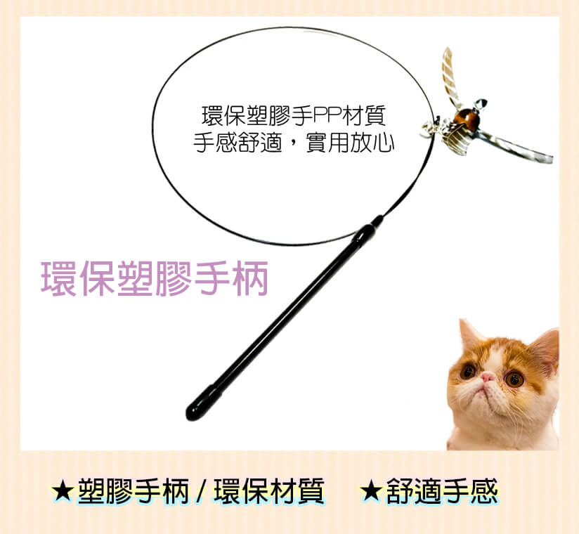 ◆彈力鋼絲◆快拆環設計◆環保塑膠手柄◆鈴鐺吸引◆可換羽毛