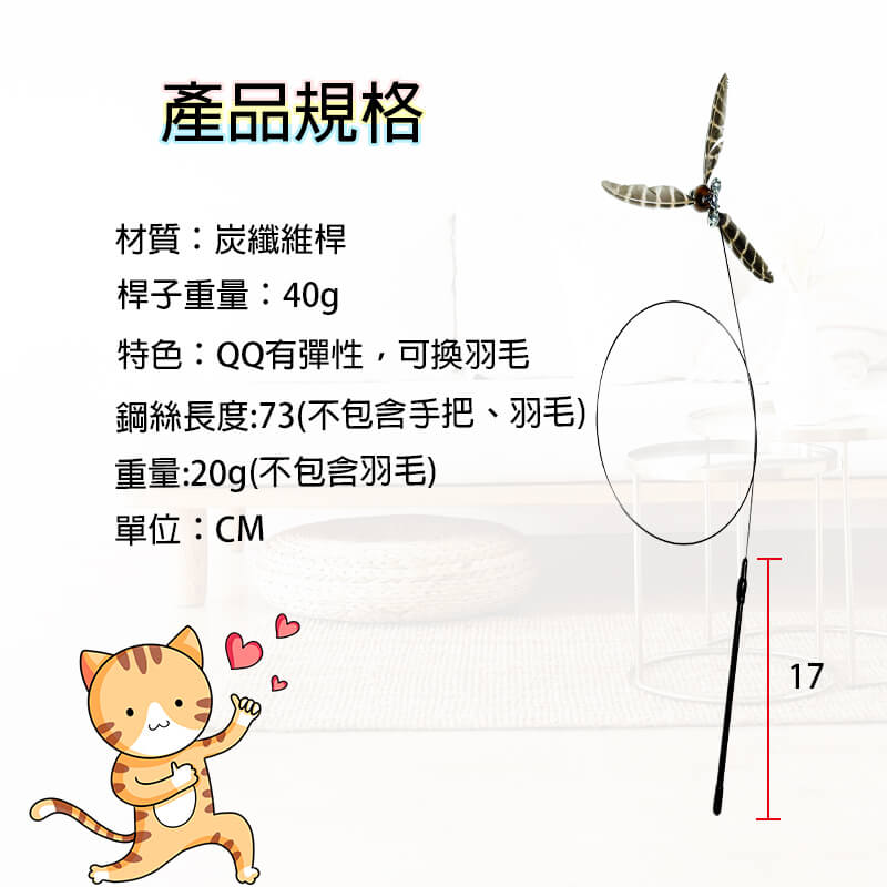 ◆彈力鋼絲◆快拆環設計◆環保塑膠手柄◆鈴鐺吸引◆可換羽毛
