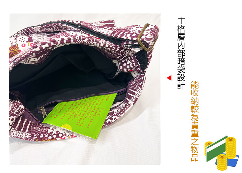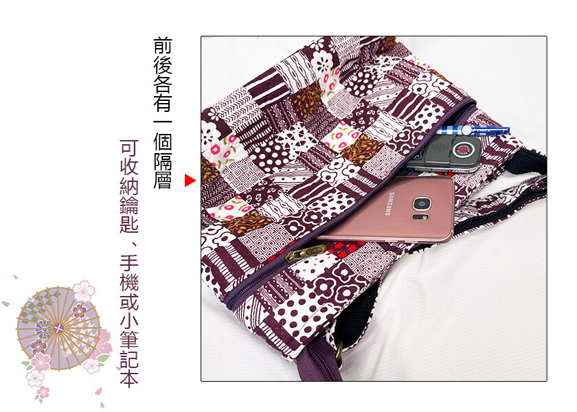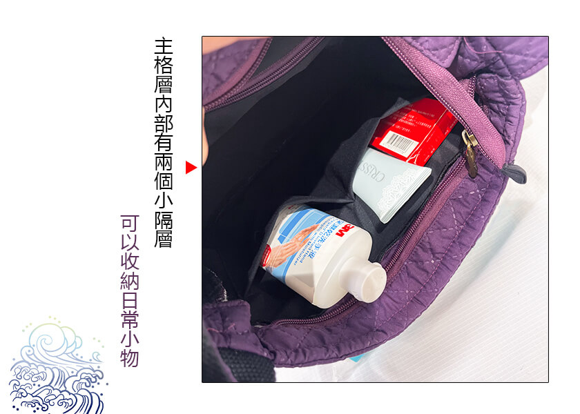 主隔層內有兩個小格層與一個暗袋,方便收納日常小物或貴重物品,前後也有各一個收納層,可以收納鑰匙、手機