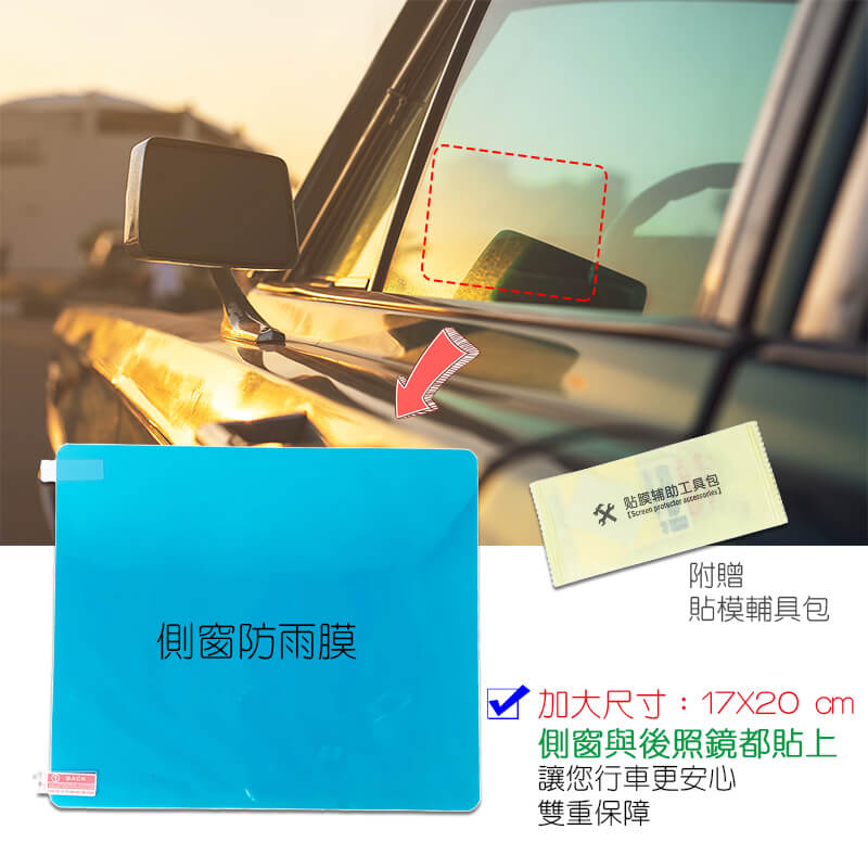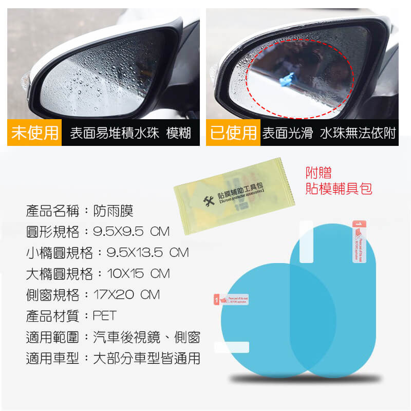 💟貼心提醒: ⚠️使用前請先詳閱使用說明 ————————————— 本品內含:防雨膜一對 規格: 1) 圓形規格:9.5X9.5 2) 小橢圓規格:9.5X13.5 3) 大橢圓規格:10X15 4) 側窗規格:17X20
