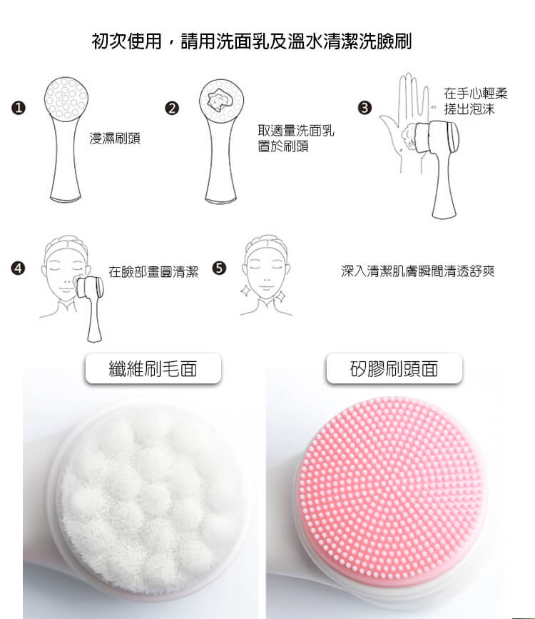 ★初次使用,請用洗面乳及溫水清潔洗臉刷