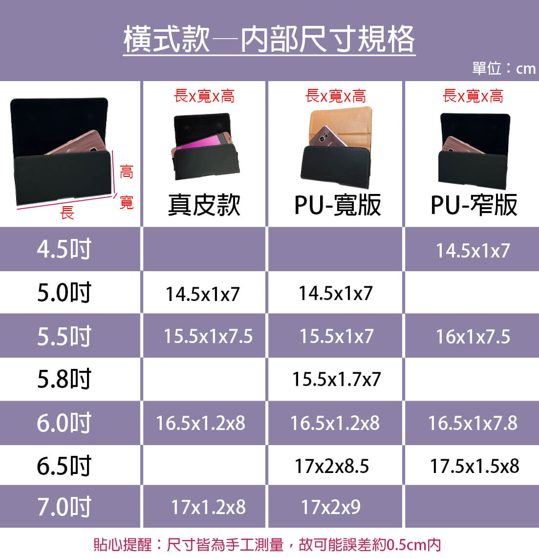 PU直式皮套尺寸說明:(五種尺寸)側邊為皮質