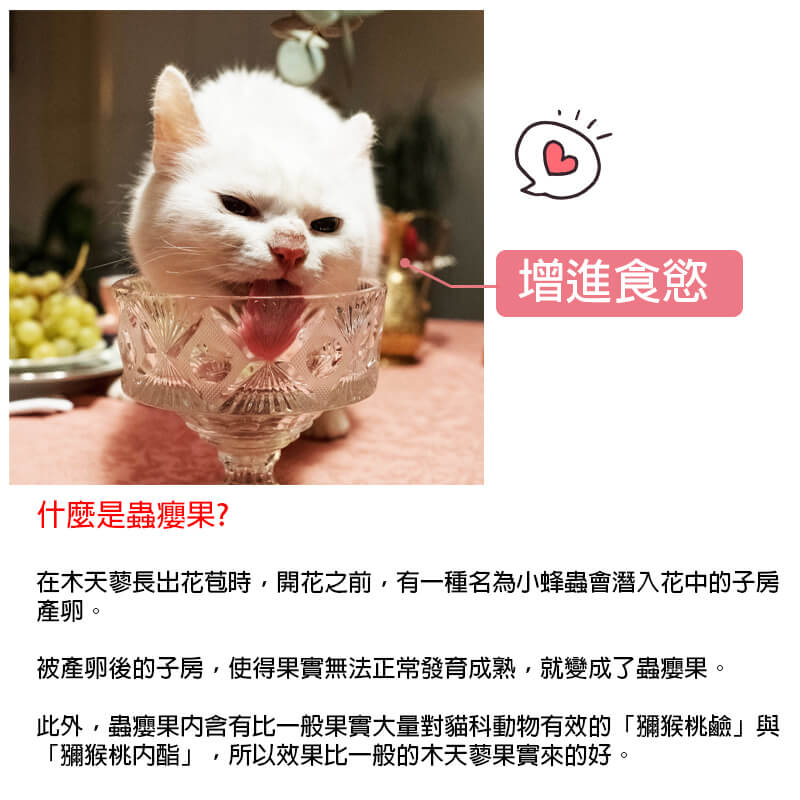 此外,蟲癭果內含有比一般果實大量對貓科動物有效的「獼猴桃鹼」與「獼猴桃內酯」,